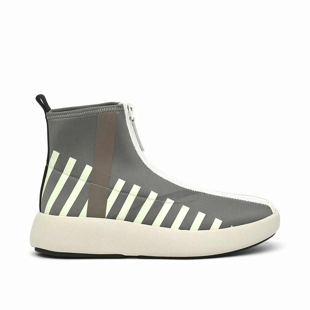 The Bo Calli is a unisex high-top sneaker with a smooth neoprene sock-like upper and ultralight rubber outsole. The sneaker is accented with bold heat pressed graphic lines and finished with a zipper at the instep for easy on and off wear.