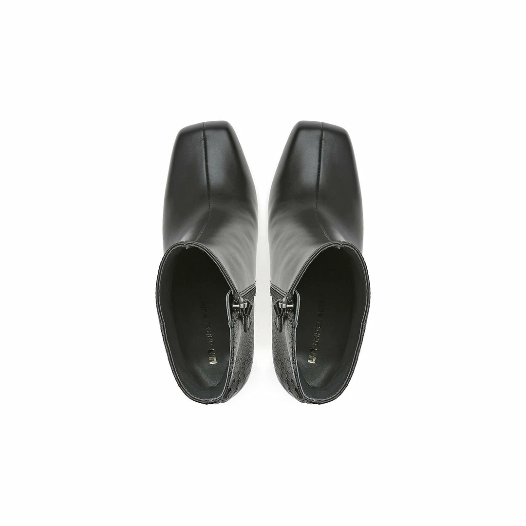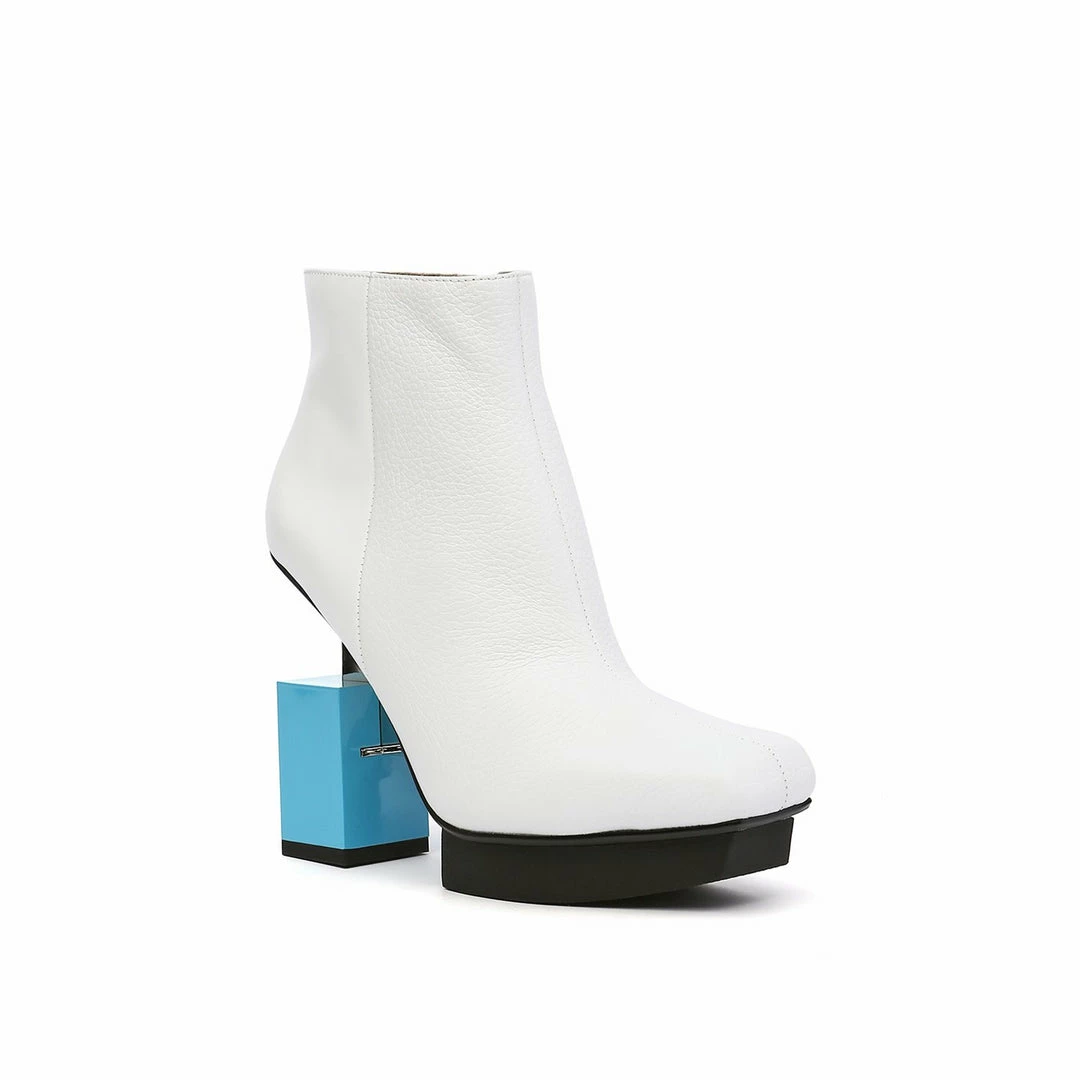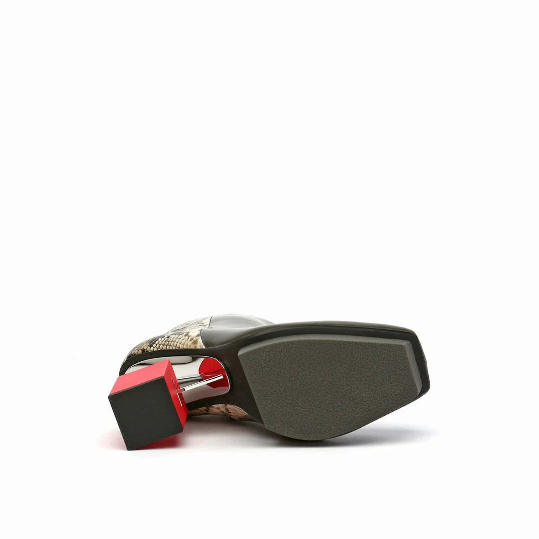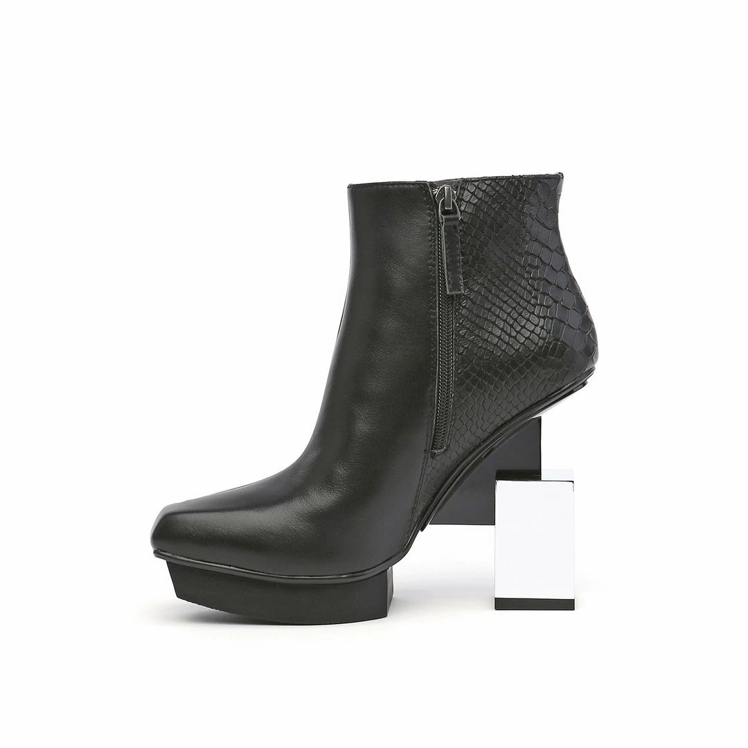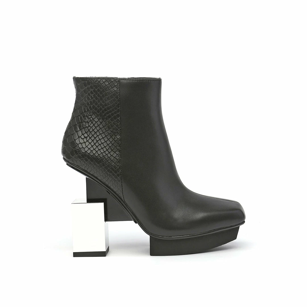 The Cube Boxy Hi is a high heel, square toe ankle boot grounded by a geometric block heel. A thin metallic structure extends from the shank to bisect the heel, giving a gravity defying illusion.