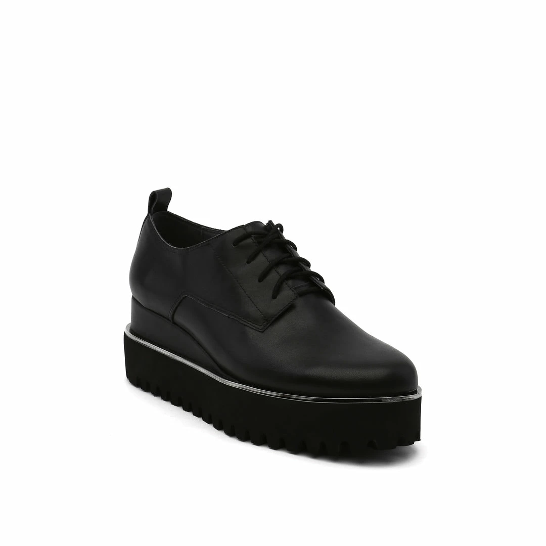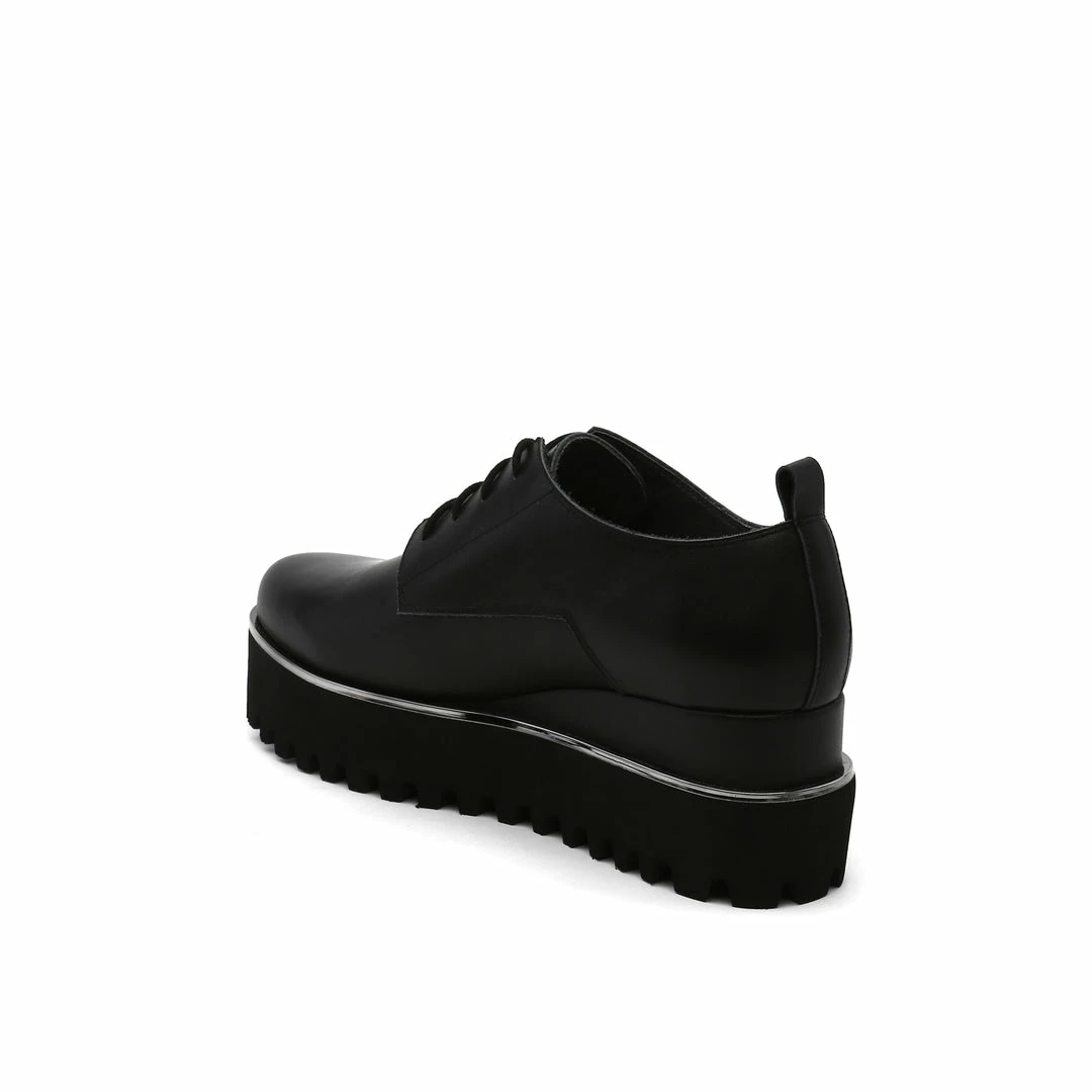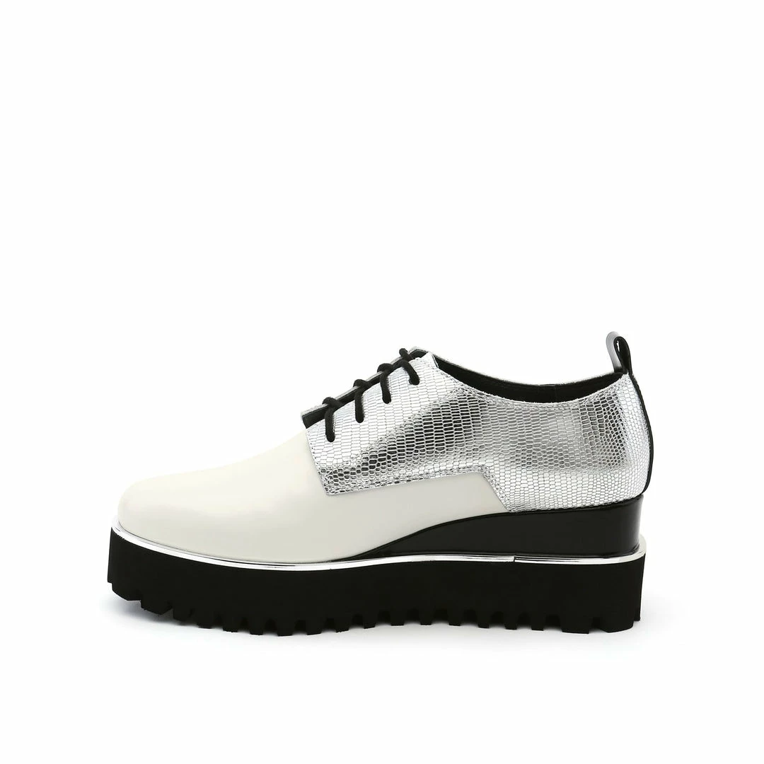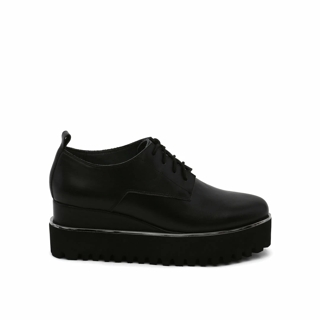 The Juko POP is a flatform oxford shoe that is lifted by a low, leather-wrapped wedge and a cleated outsole.