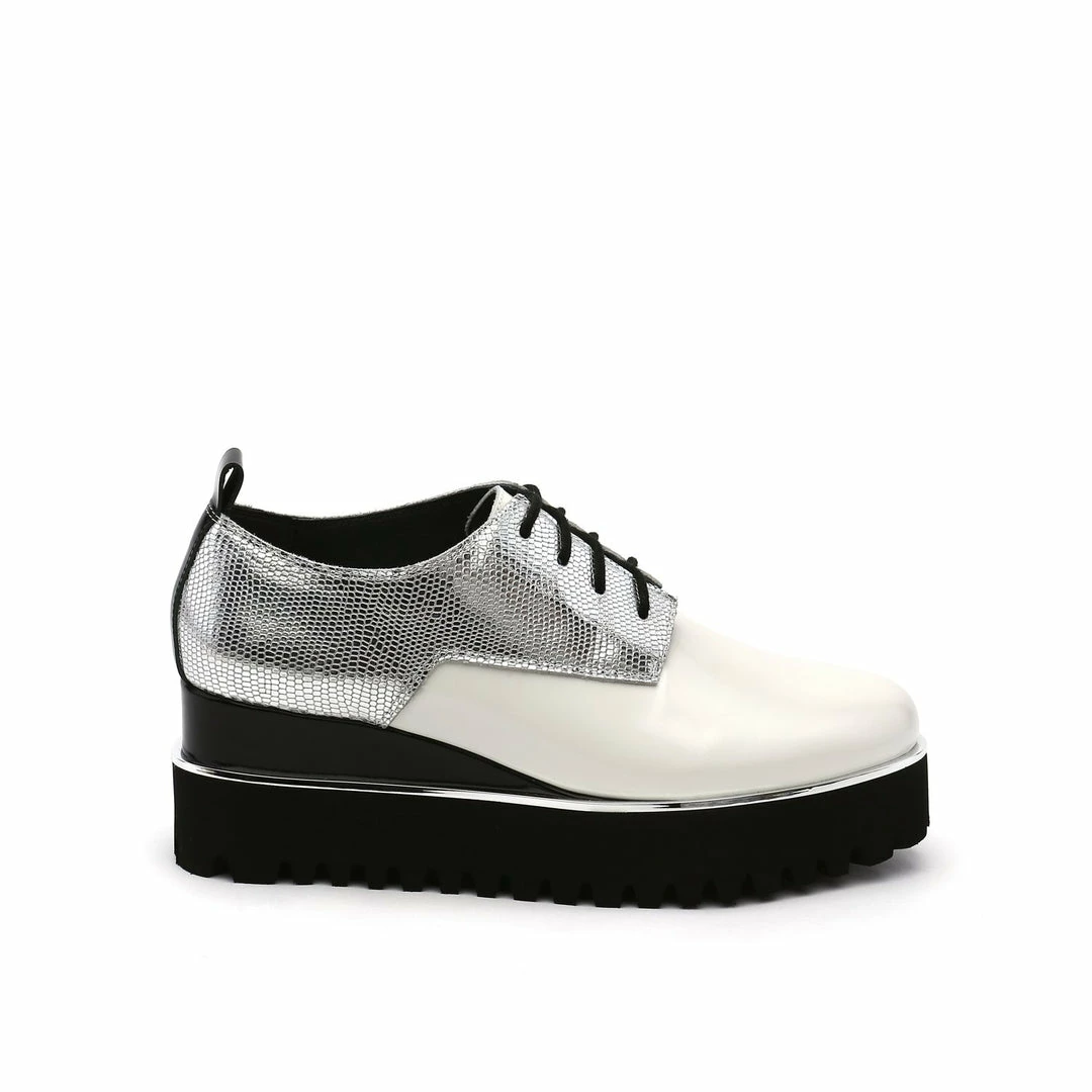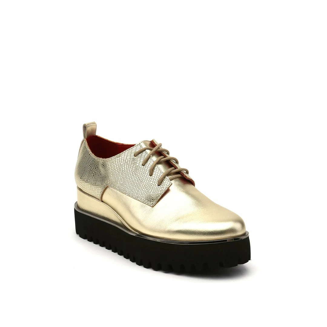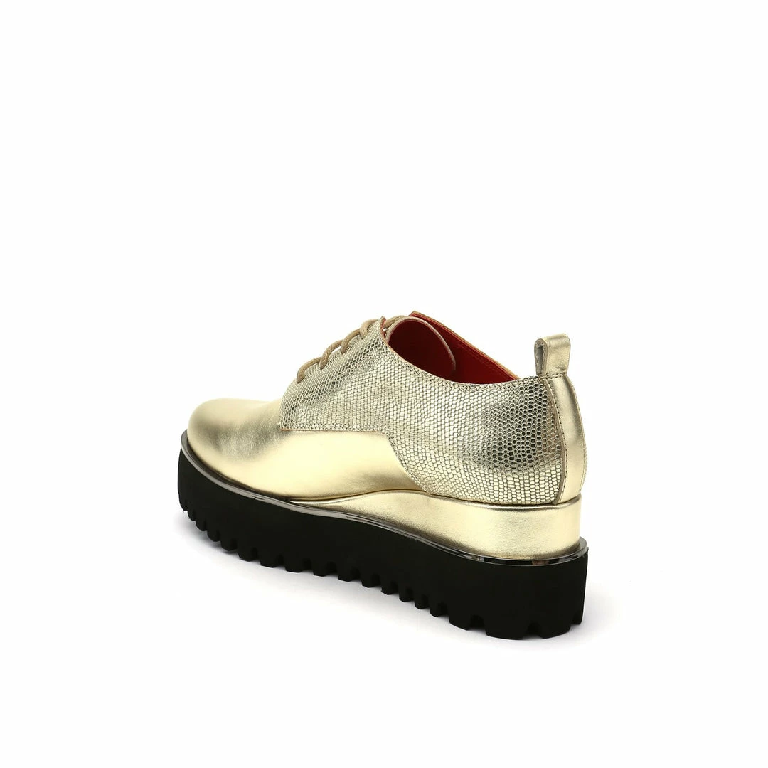 The Juko POP is a flatform oxford shoe that is lifted by a low, leather-wrapped wedge and a cleated outsole.