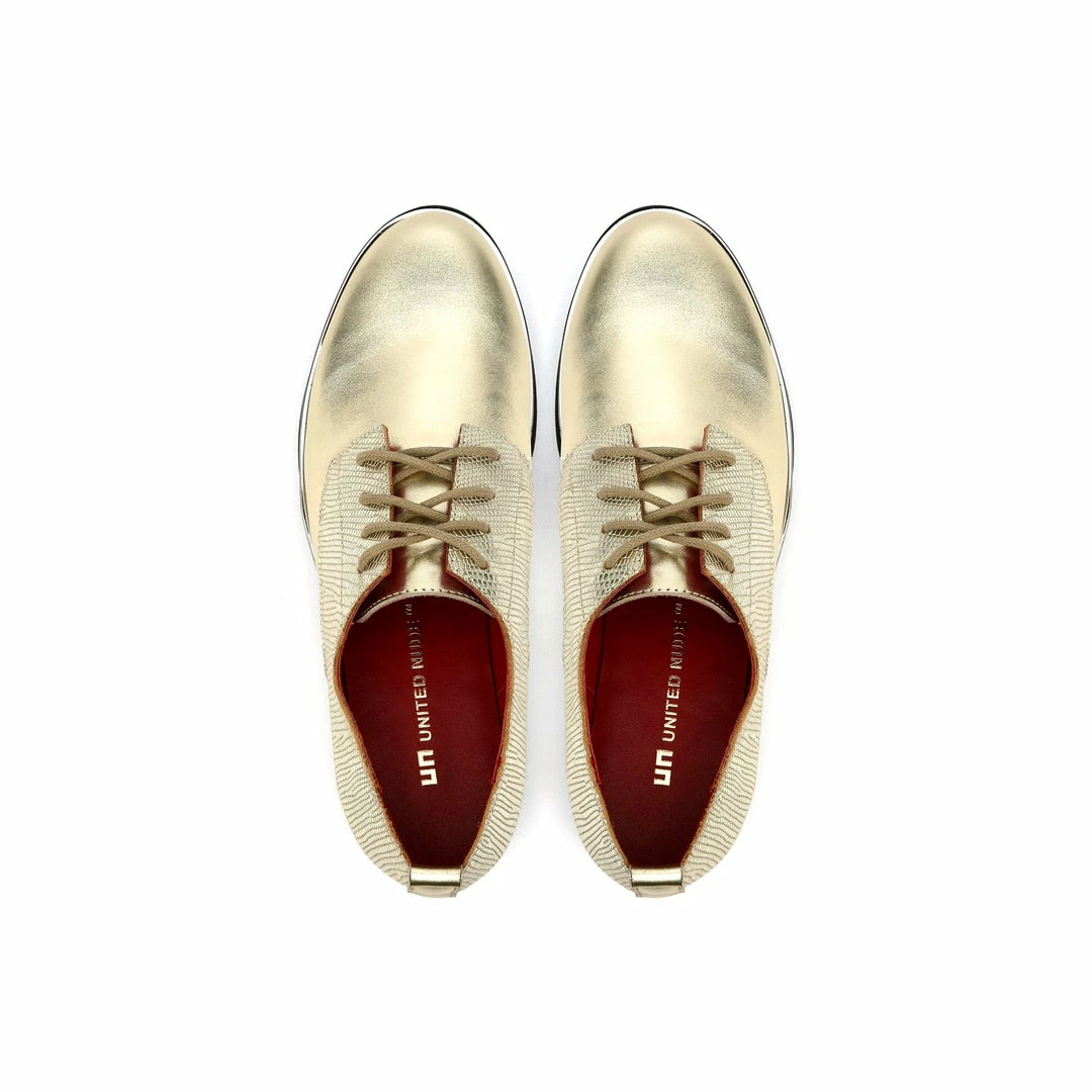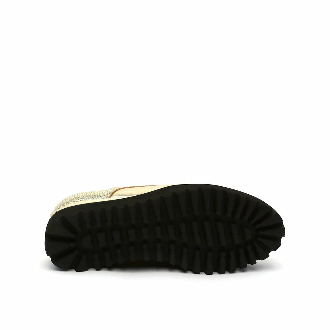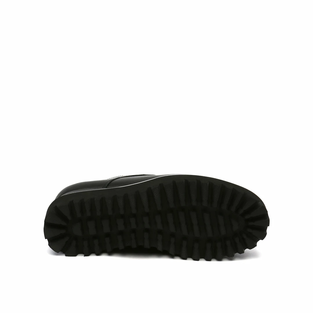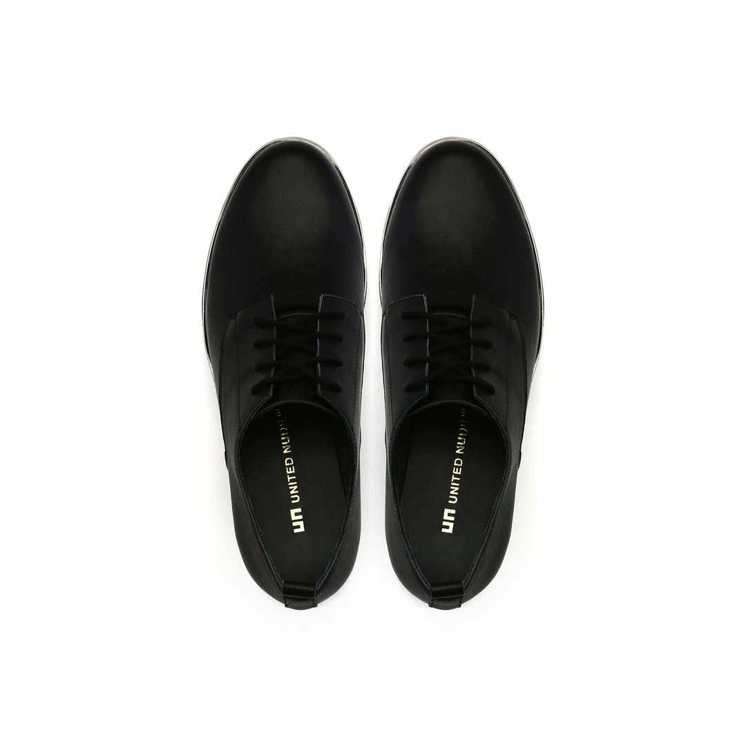 The Juko POP is a flatform oxford shoe that is lifted by a low, leather-wrapped wedge and a cleated outsole.