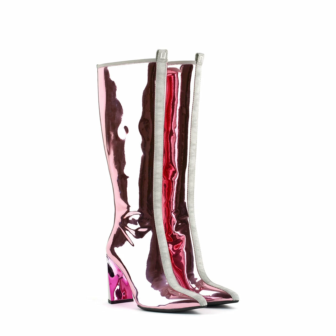 The Lucid Molten Hi is a futuristic silhouette offering a knee-high boot on-top United Nude’s signature Molten heel. A rear zip and pull tab offer easy entrance and comfort, whilst still making a statement.