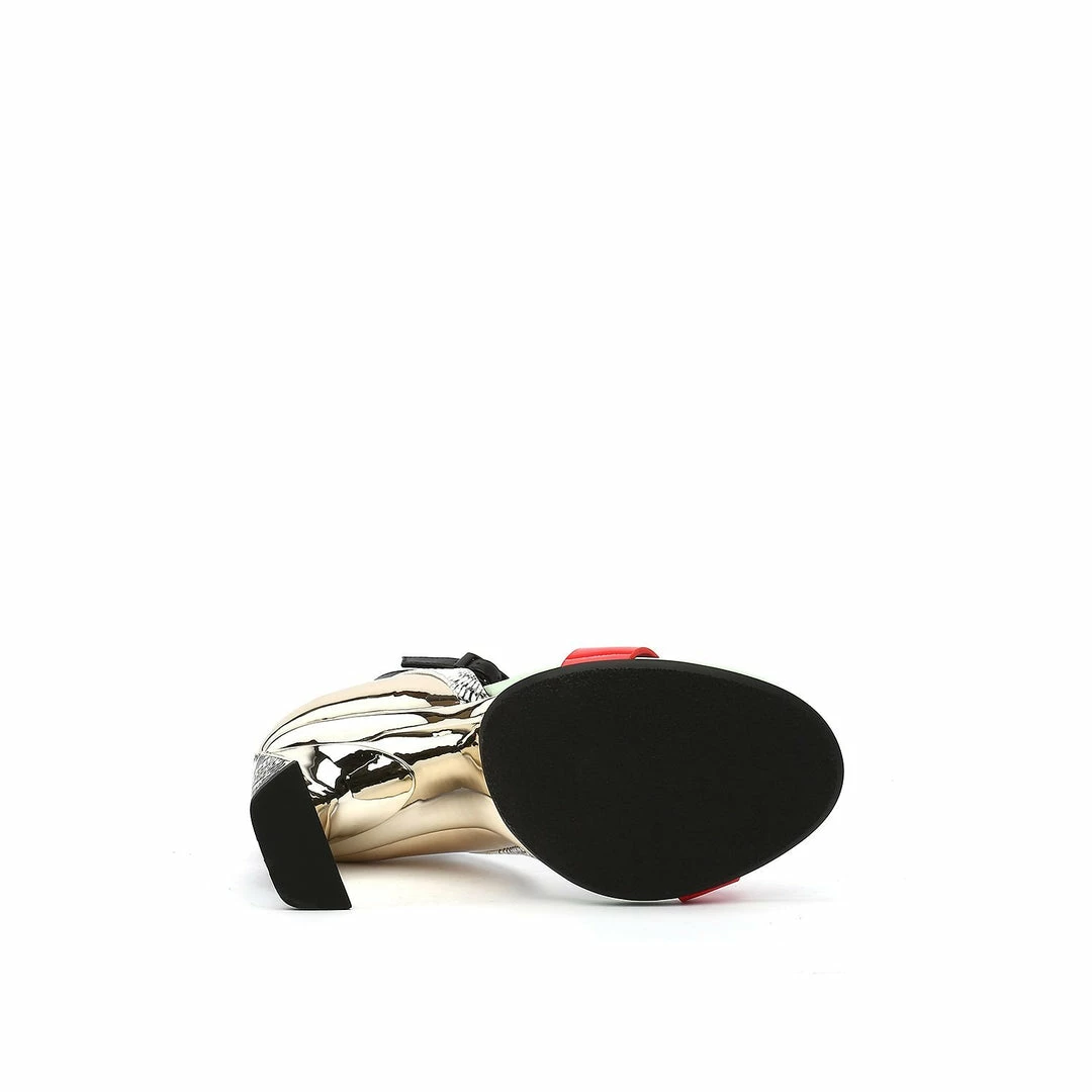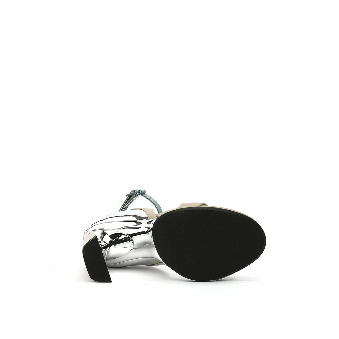 The Molten Flow Sandal Hi is an elegant two strap high heel set on a slim, yet robust heel. The metallic silhouette gives the impression of liquid metal being gracefully poured over the shoe.