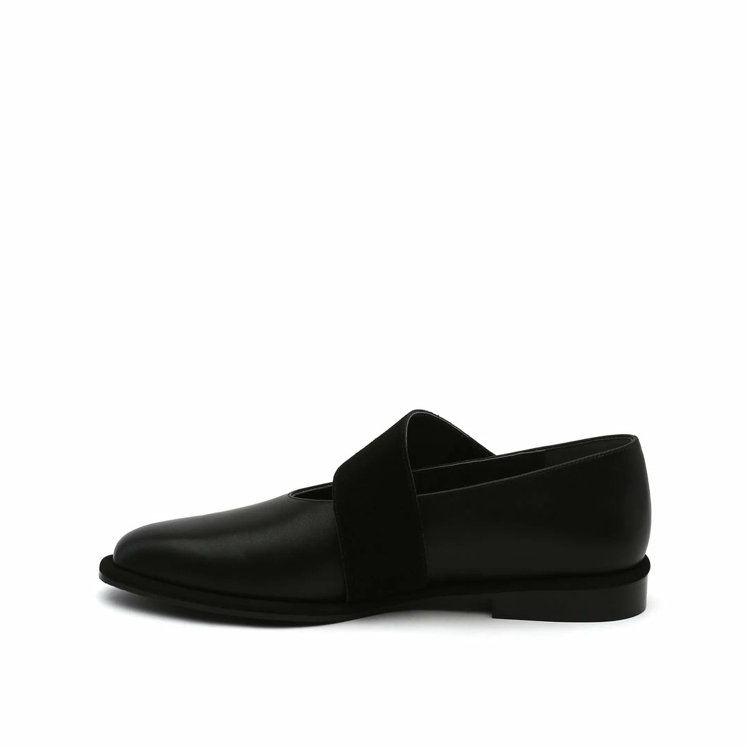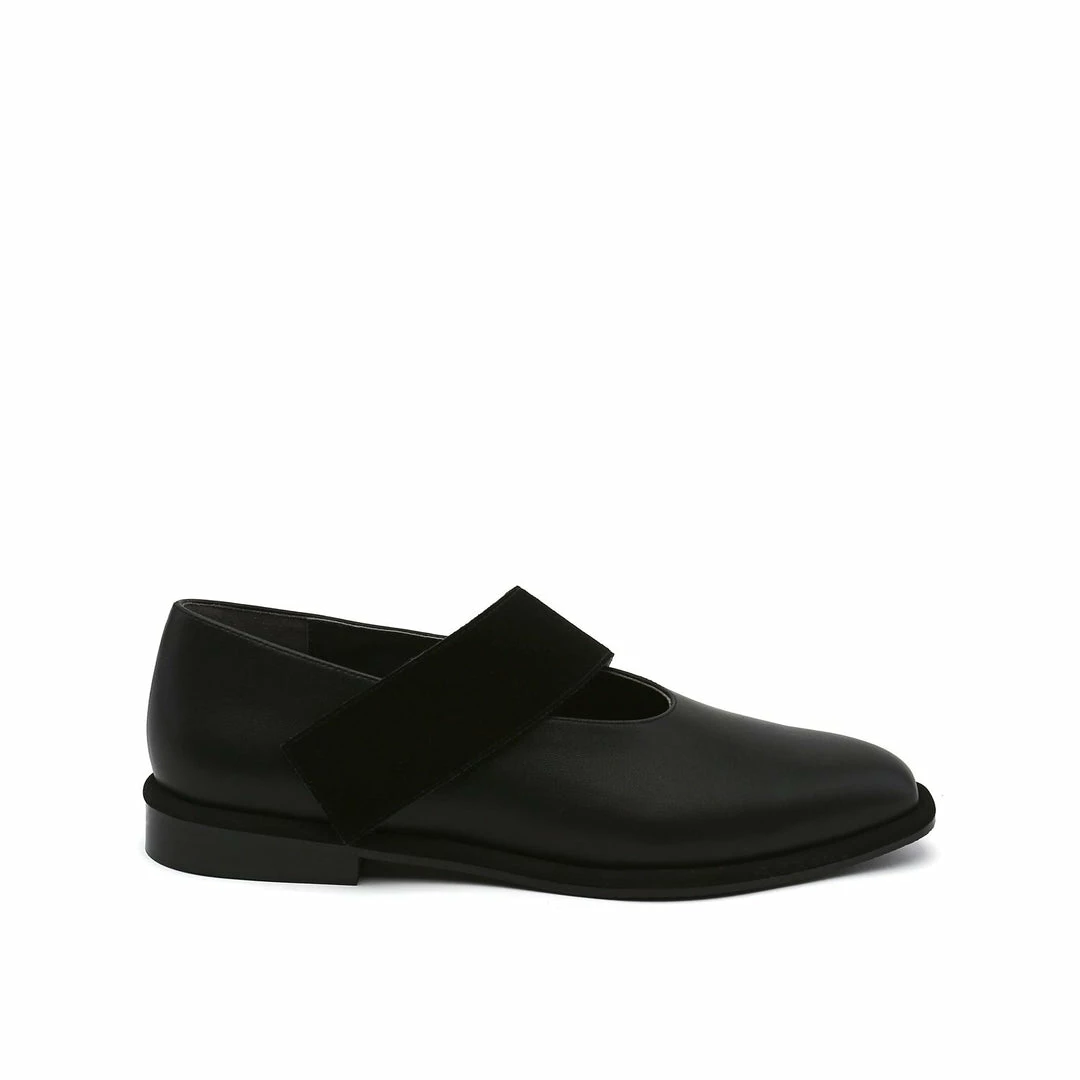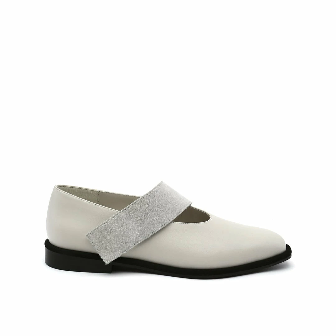 The Pure Mary is a modern leather crafted Mary jane with a broad contrasting suede strap that fastens diagonally over the foot for a secure fit.