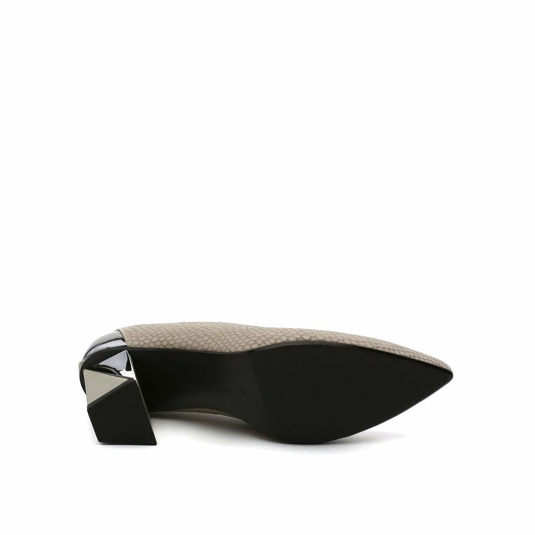 The Twist Flow Pump is a mid height pointy-toe pump with a stacked leather and contorted chrome plated heel. The heels mirrored surface climbs around the shoe to enhance this classic silhouette.