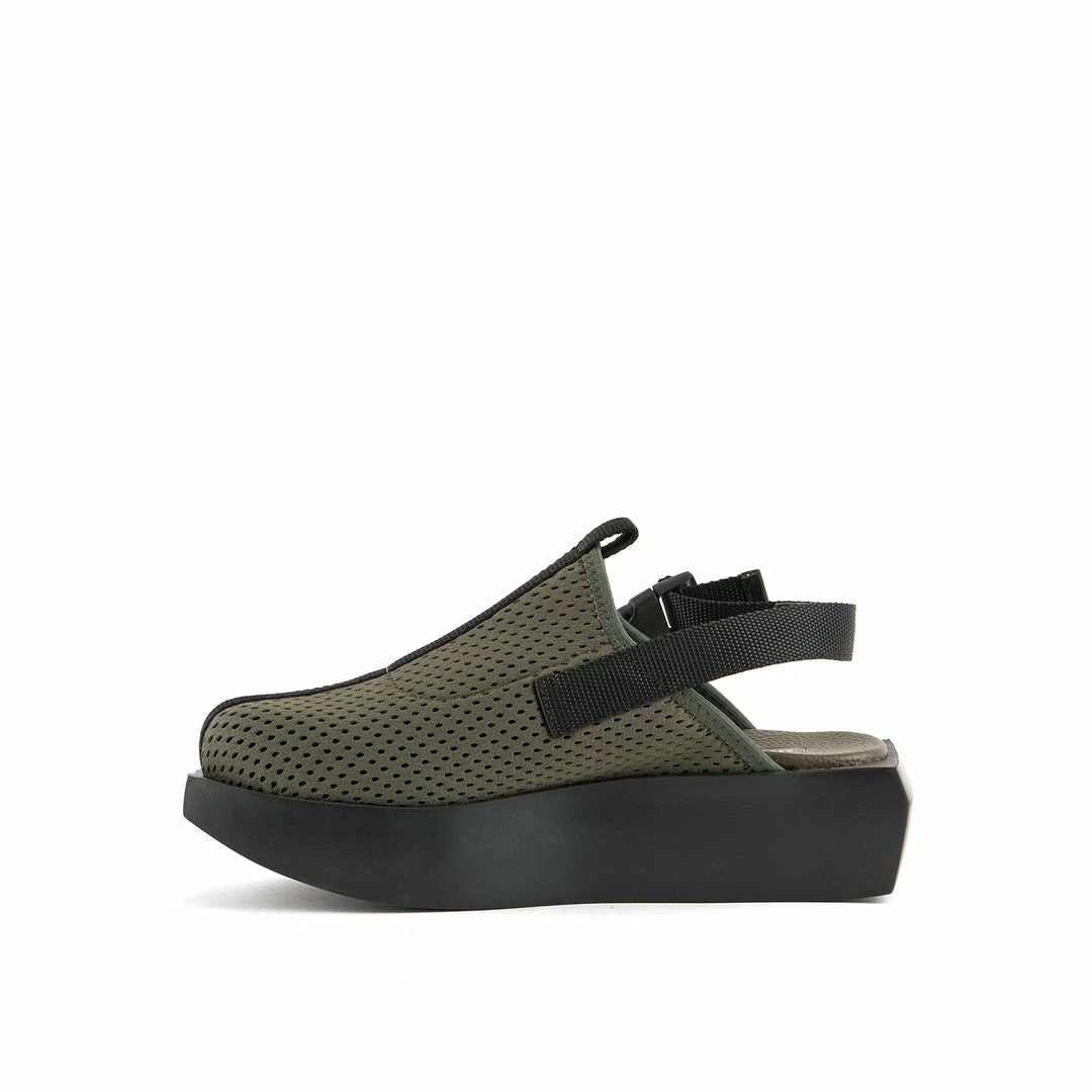 The Wa Mule Lo is a round-toe flatform with a sculptural EPR outsole and an adjustable nylon backstrap with buckle closures.