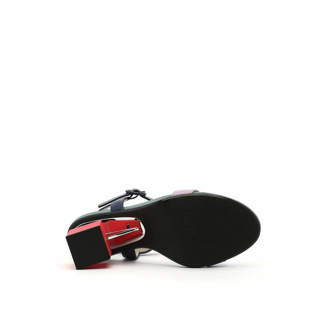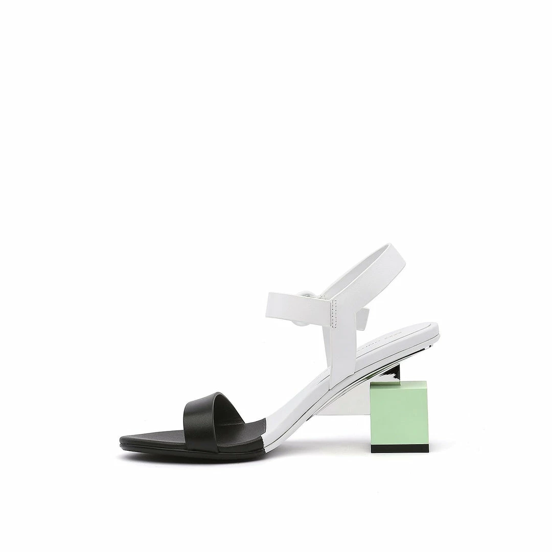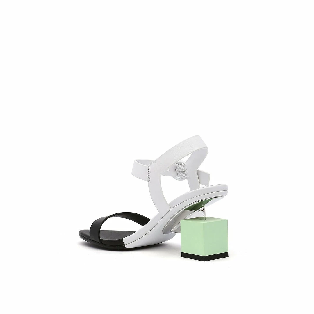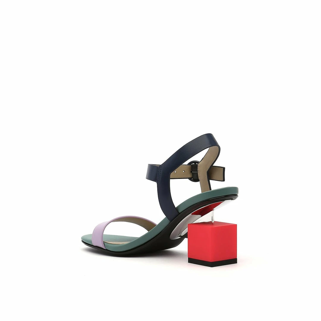 A slim metallic profile slices into the statement cube heel, giving the illusion of a floating heel on the Cube Sandal Mid. Sleek and slim leather straps balance out the statement, head turning block heel.