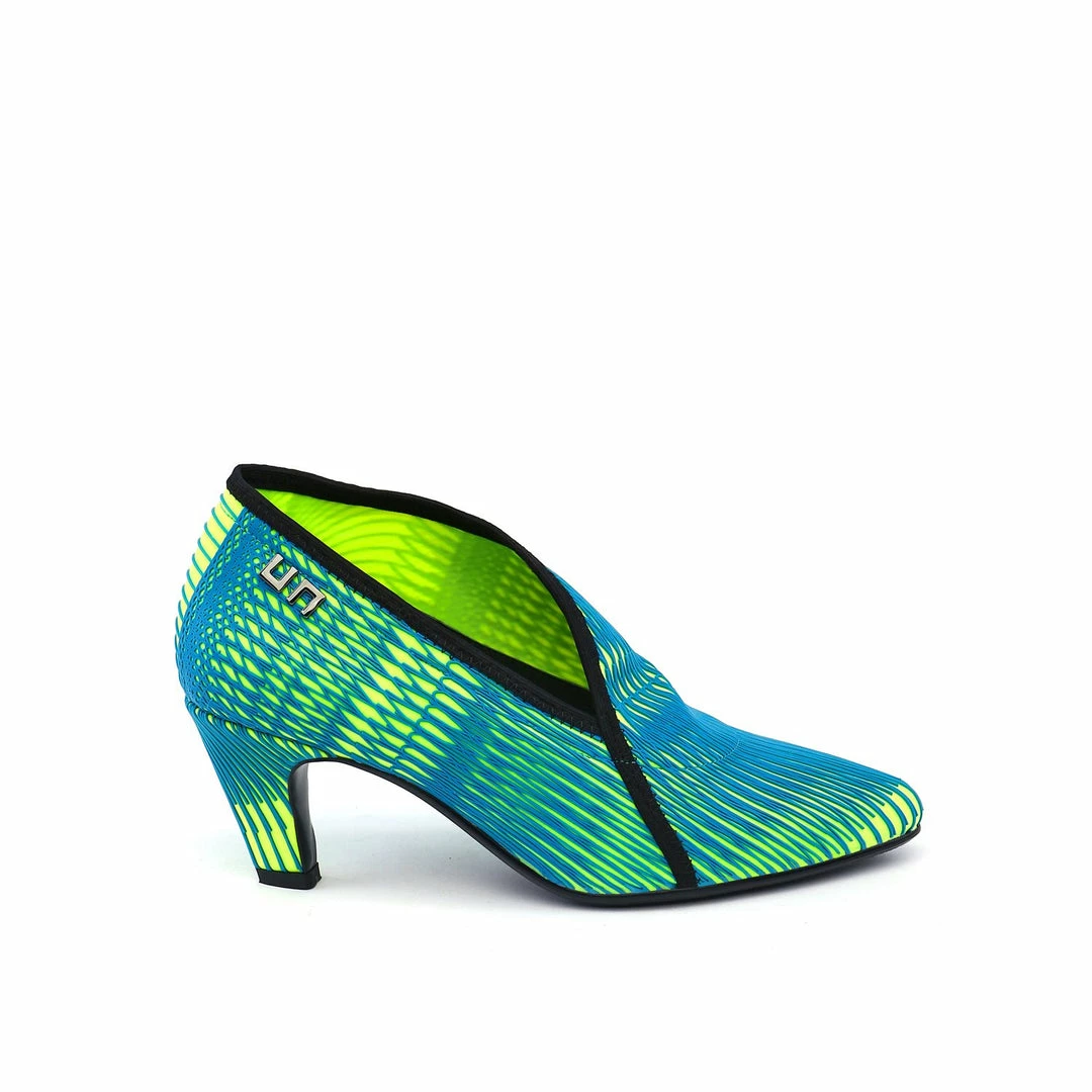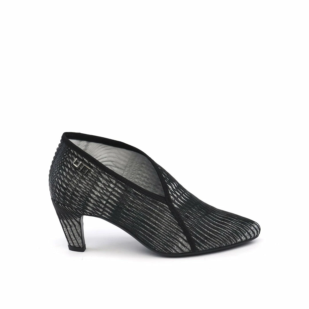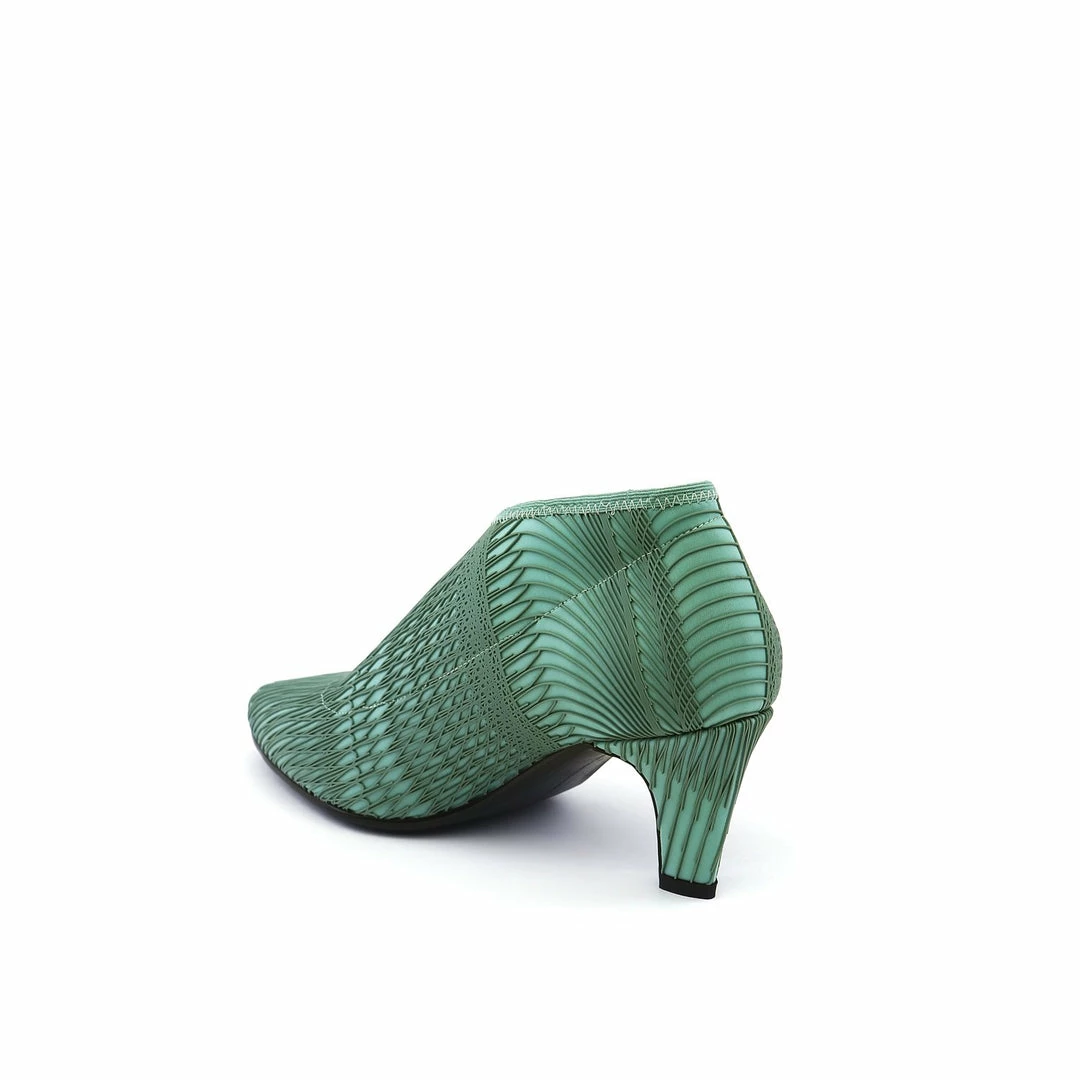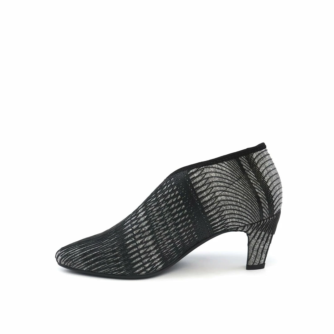 The Fold Lite Mid is a mid-heel ankle bootie with a soft almond toe and asymmetrical top line.