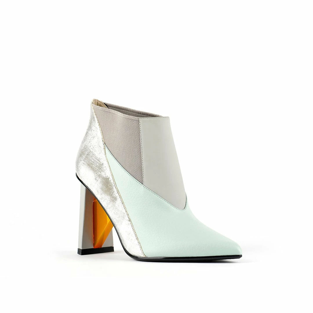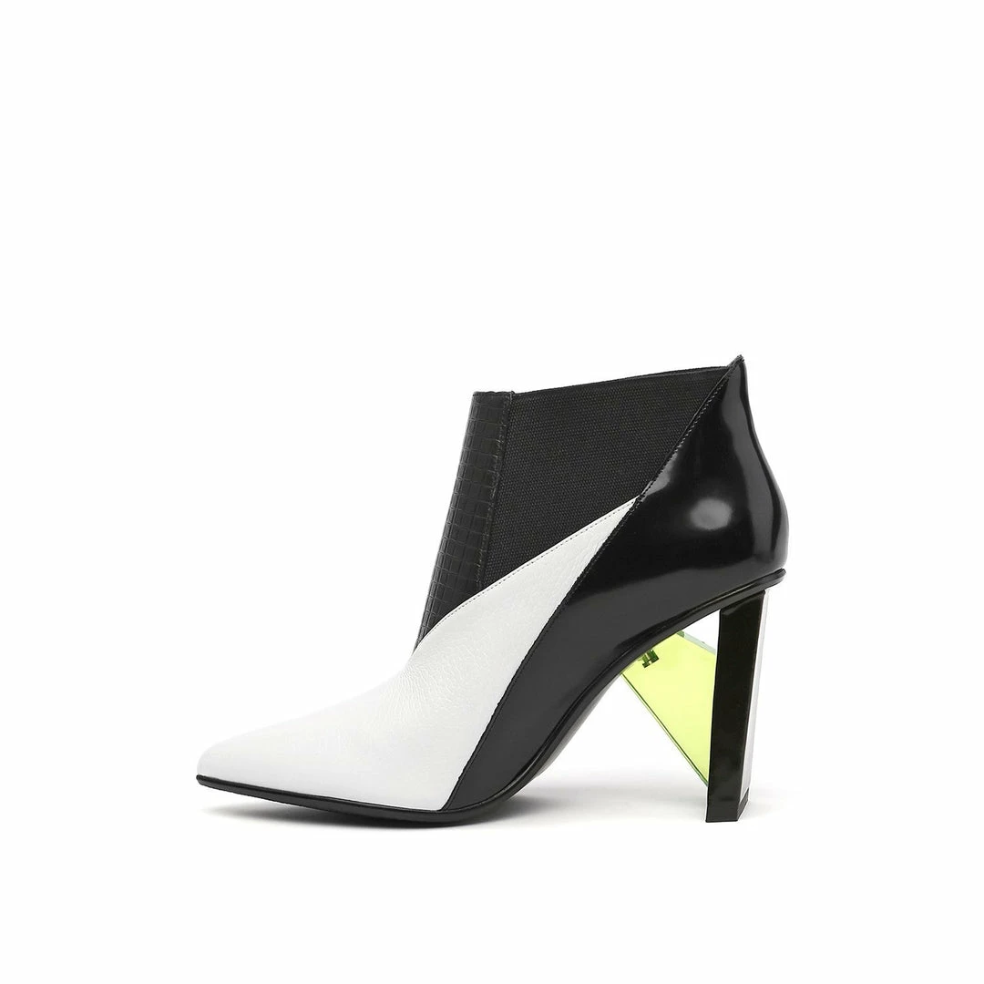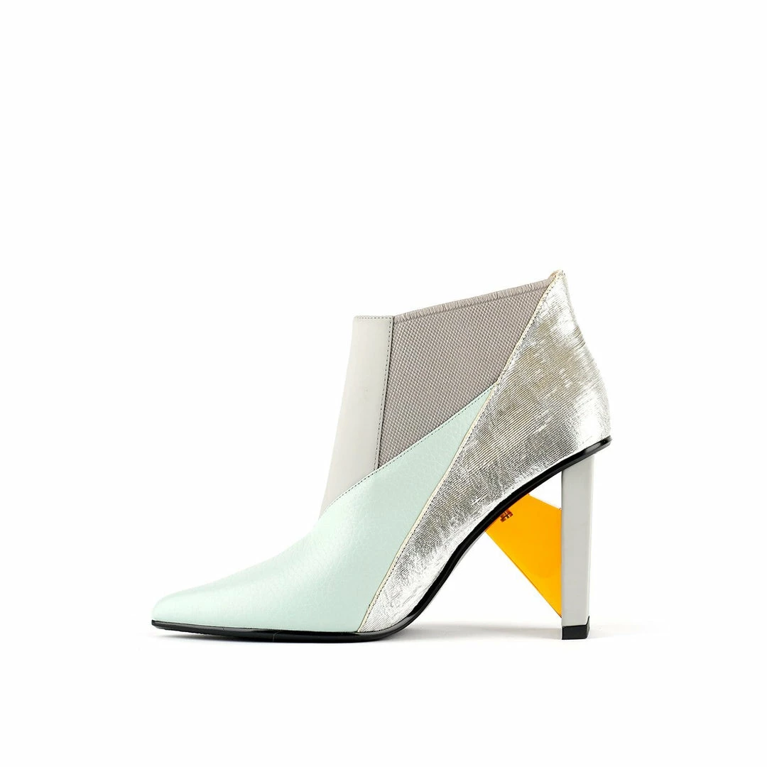 The Spark Bootie Hi is a pointed toe high heel boot with a multi-material abstract heel. A patchwork of leathers and elastics create a bold statement to complement the statement heel.