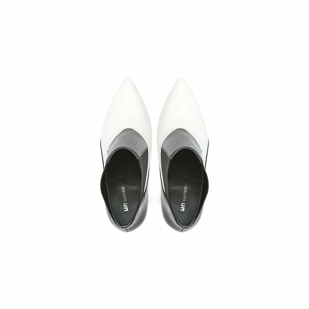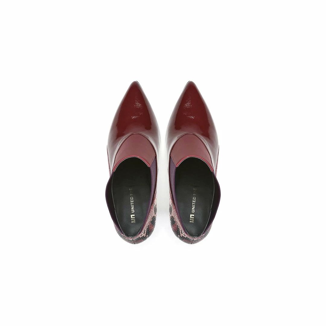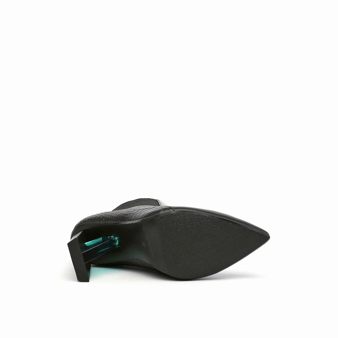 The Spark Bootie Hi is a pointed toe high heel boot with a multi-material abstract heel. A patchwork of leathers and elastics create a bold statement to complement the statement heel.