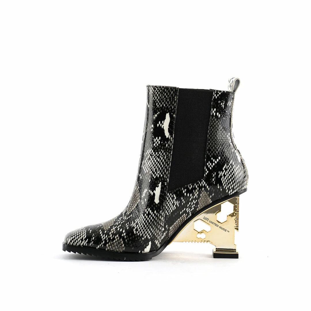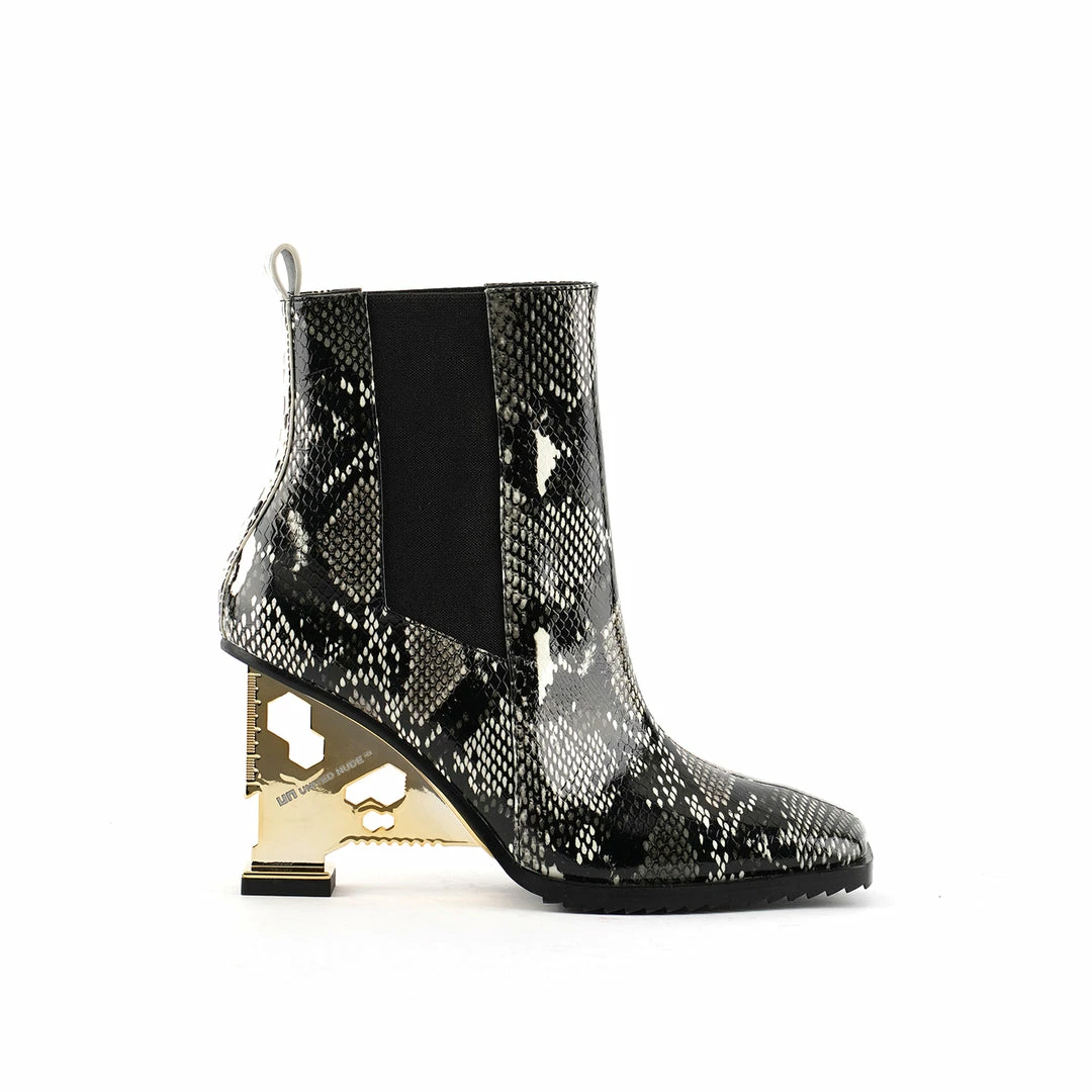 The Tool Chelsea mirrors the utilitarian look of multitools whilst offering comfortable and stable wearability. This geometric Chelsea boot is made of tumbled leather in a square toe shape with leather rand. This style is part of the Art Group collection, representing simple upper silhouettes combined with carefully designed heels that speak to United Nude’s bold aesthetic.