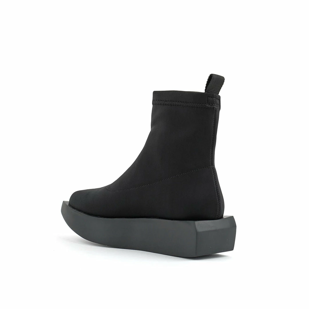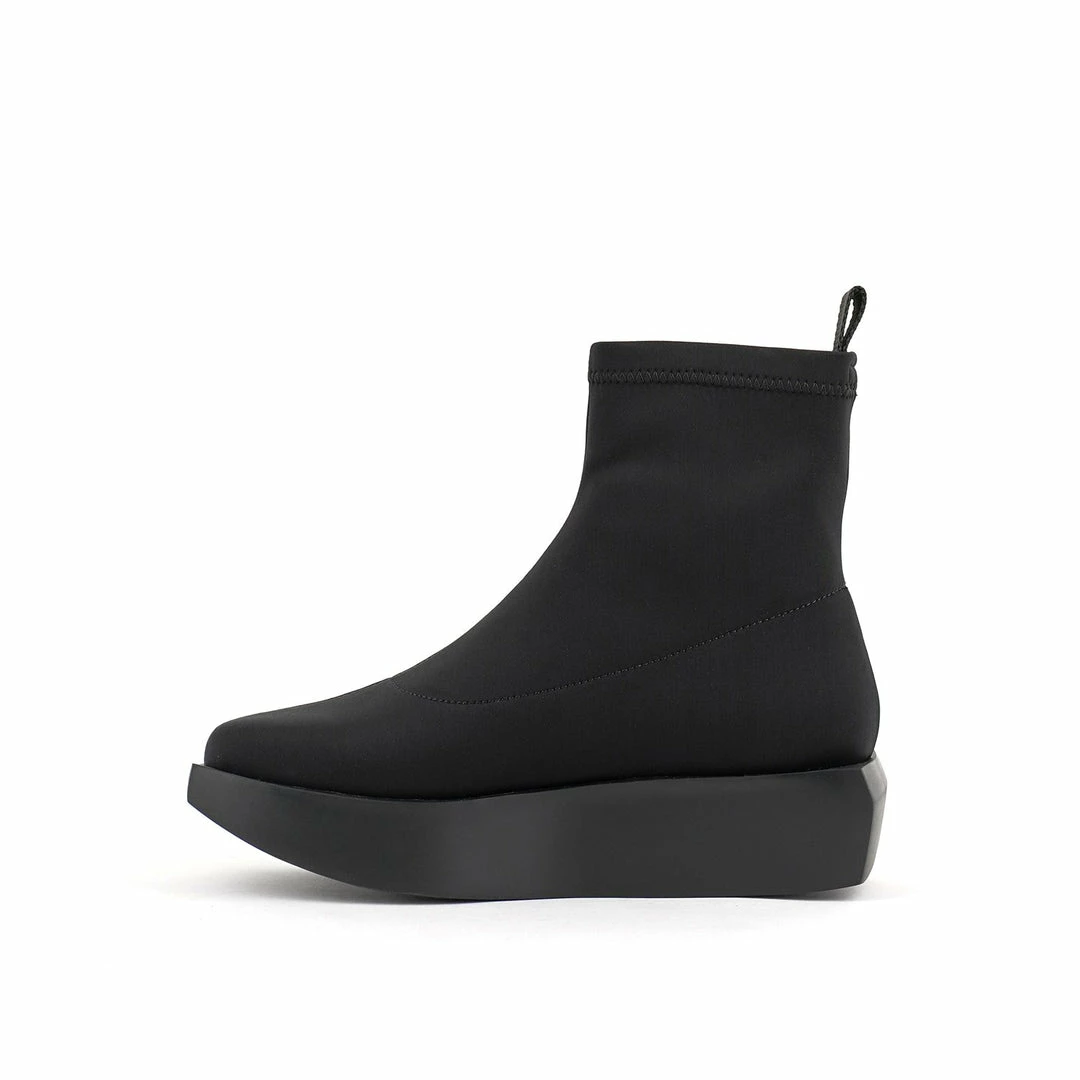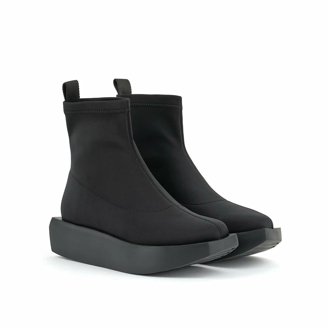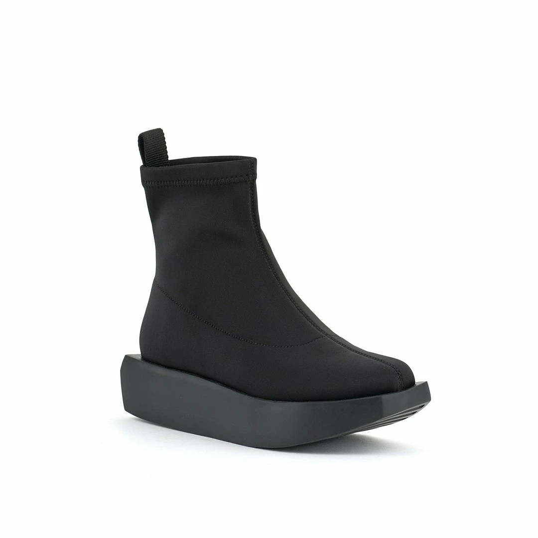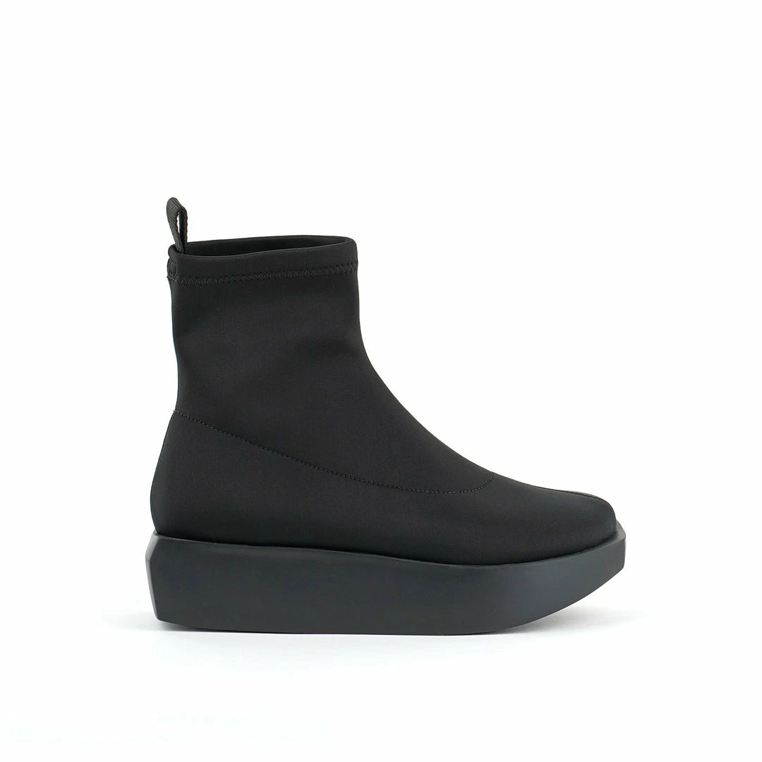 The Wa Bootie Lo features a minimalist sock-like neoprene upper, padded leather insole, and platform rubber wedge.